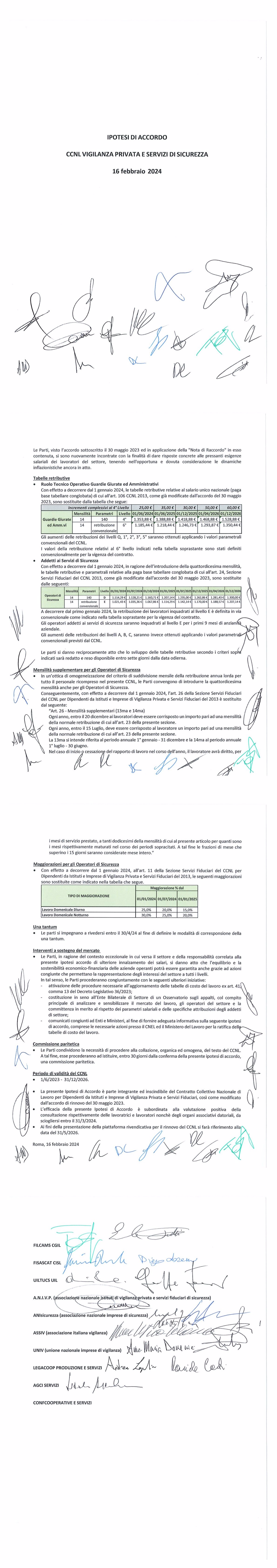 «L’intesa, subordinata alla consultazione delle lavoratrici e dei lavoratori del settore – sottolinea il sindacalista – prevede significativi aumenti per il personale addetto alla vigilanza privata, che vedranno un aumento di 110 euro a regime ad integrazione dei 140 euro già previsti con il rinnovo del Contratto nazionale nel 2023, parametrati sul 4° livello. Aumenti importanti sono stati definiti per gli addetti ai servizi di sicurezza per complessivi 350 euro a regime parametrati al livello D, e dal 2024 potranno contare anche sulla quattordicesima mensilità».